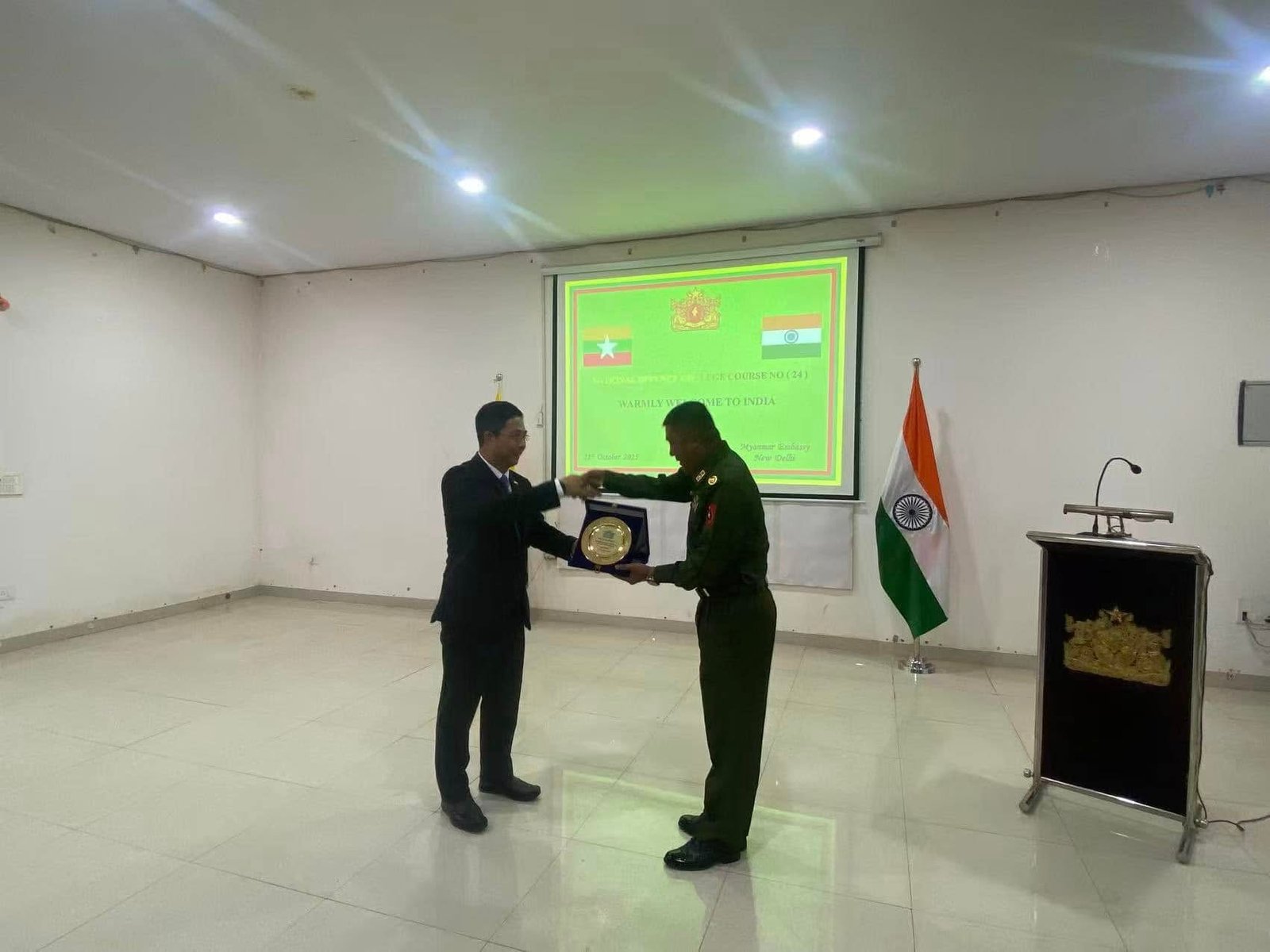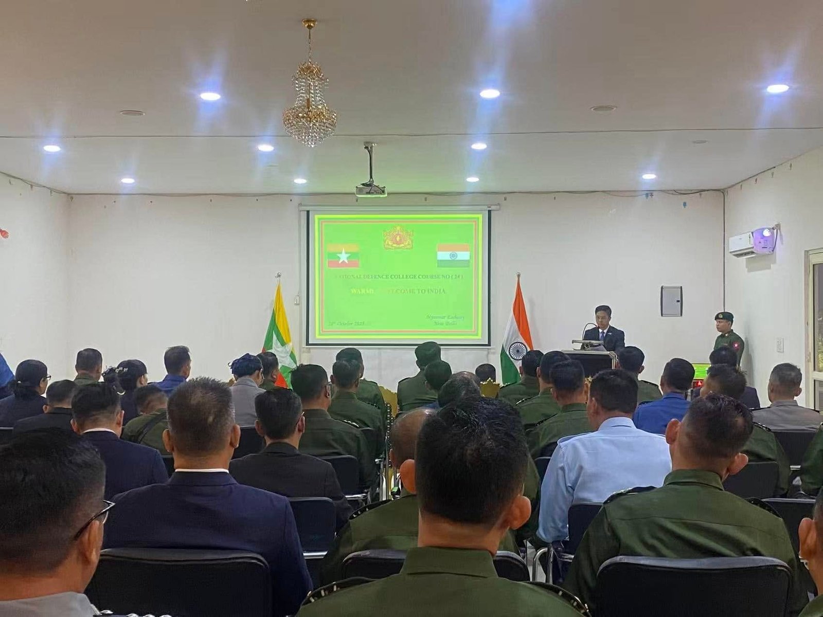 အိန္ဒိယသမ္မတနိုင်ငံဆိုင်ရာ မြန်မာသံအမတ်ကြီး ဦးဇော်ဦးသည် အိန္ဒိယနိုင်ငံသို့ လေ့လာရေး ခရီးရောက်ရှိနေသည့် မြန်မာနိုင်ငံ နိုင်ငံတော်ကာကွယ်ရေးတက္ကသိုလ်မှ ဒုတိယ ကျောင်းအုပ်ကြီး၊ သင်တန်းအမှတ်စဉ် (၂၄/၂၀၂၅)မှ နည်းပြအရာရှိကြီးများနှင့် သင်တန်းသား အရာရှိကြီးများအား ၂၁-၁၀-၂၀၂၅ ရက်နေ့၊ (၁၀၀၀)နာရီအချိန်တွင် မြန်မာသံရုံး၊ နယူးဒေလီ မြို့၌ လက်ခံတွေ့ဆုံ၍ နုတ်ခွန်း ဆက်စကားပြောကြားခြင်း၊ အထွေထွေဆွေးနွေးရှင်းလင်း ပြောကြားခြင်းများ ပြုလုပ်ခဲ့ပါသည်။ ထို့နောက် မြန်မာသံအမတ်ကြီးက ကိုယ်စားလှယ် အဖွဲ့အား အမှတ်တရ ဂုဏ်ပြုလက်ဆောင်များ ပေးအပ်ခဲ့ပြီး အစားအသောက်များဖြင့် တည်ခင်းဧည့်ခံခဲ့ပါသည်။