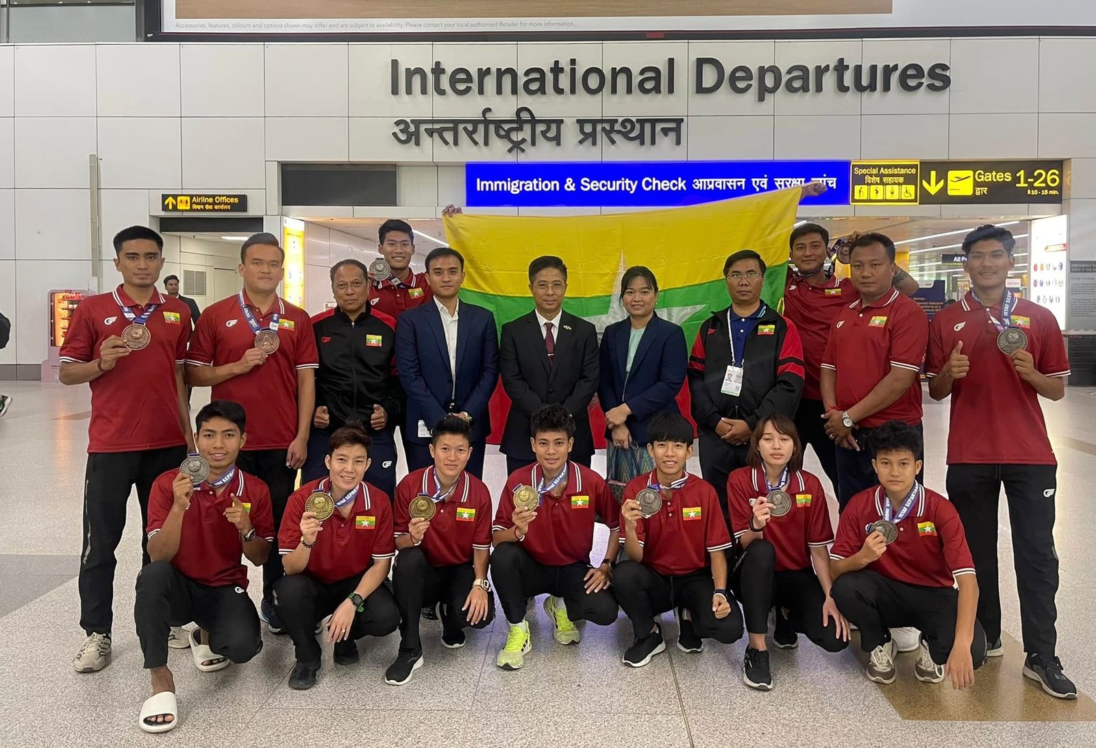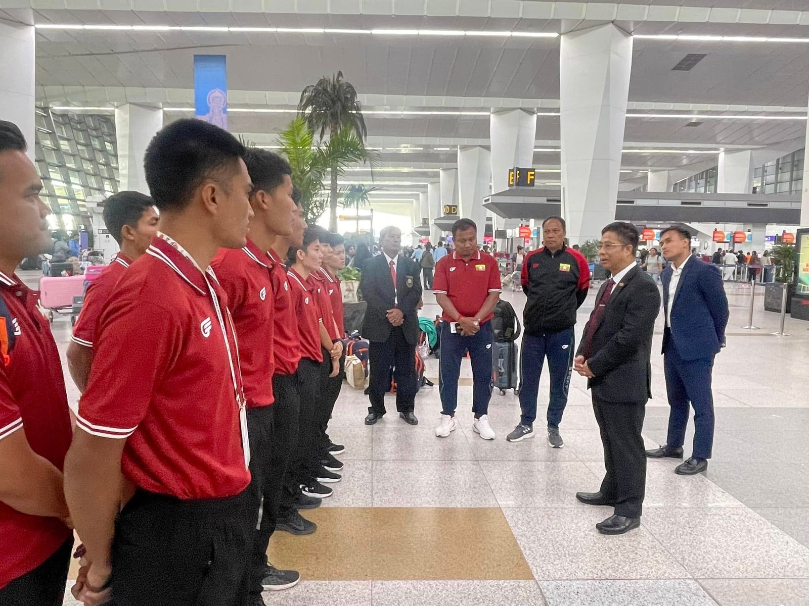 His Excellency Mr. Zaw Oo, Ambassador of Myanmar to India extended a warm farewell to the national Sepak Takraw team at the international airport, congratulating them on their participation and achievements in the competition. He then commemorated the occasion with a photo session. The Ambassador, along with officials from the Myanmar Embassy, also provided necessary assistance to the delegation.