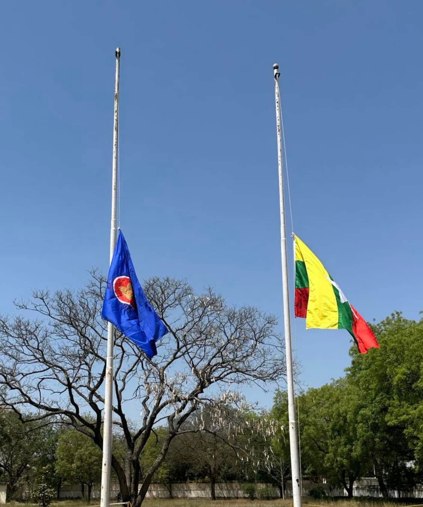 In observance of the national mourning period from 31st March to 6th April, the national flag at the Embassy of the Republic of the Union of Myanmar will be flown at half-mast.As part of the national mourning campaign, the Ambassador of Myanmar, along with Embassy officials and representatives from the Office of the Military, Naval, and Air Attaché in New Delhi, participated in a solemn one-minute silence on 1 April 2025. This was observed in front of the flag flown at half-mast, at the local time corresponding to 12:51:02 hrs. Myanmar Standard Time, in tribute to the tragic loss of life caused by the devastating earthquake that struck central Myanmar on 28th March 2025.