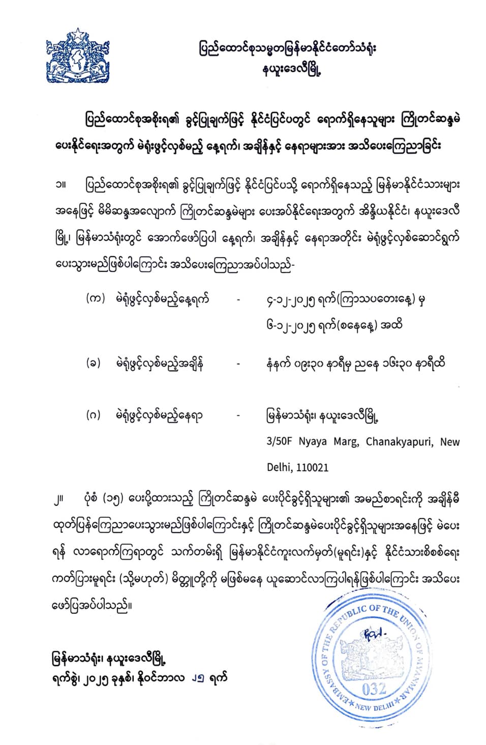 ၂၀၂၅ ခုနှစ်၊ အထွေထွေရွေးကောက်ပွဲ၌ နိုင်ငံပြင်ပတွင်ရောက်ရှိနေသူများ ကြိုတင်ဆန္ဒမဲပေးနိုင်ရေးအတွက် မဲရုံဖွင့်လှစ်မည့်နေ့ရက် အသိပေးကြညာခြင်း (၂၅-၁၁-၂၀၂၅၊ နယူးဒေလီ)