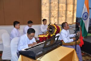 The reception commenced with the rendition of the national anthems of Myanmar and India, followed by a keynote address delivered by His Excellency Mr. Zaw Oo, Ambassador of Myanmar to India. As a symbolic gesture of friendship and commemoration, the Ambassador and the Chief Guest jointly cut a ceremonial cake, followed by a group photograph session. Guests were then served a buffet dinner featuring Indian cuisine, along with two traditional Myanmar delicacies—coconut noodle soup and tea leaf salad—offering them a taste of Myanmar’s unique flavors.
